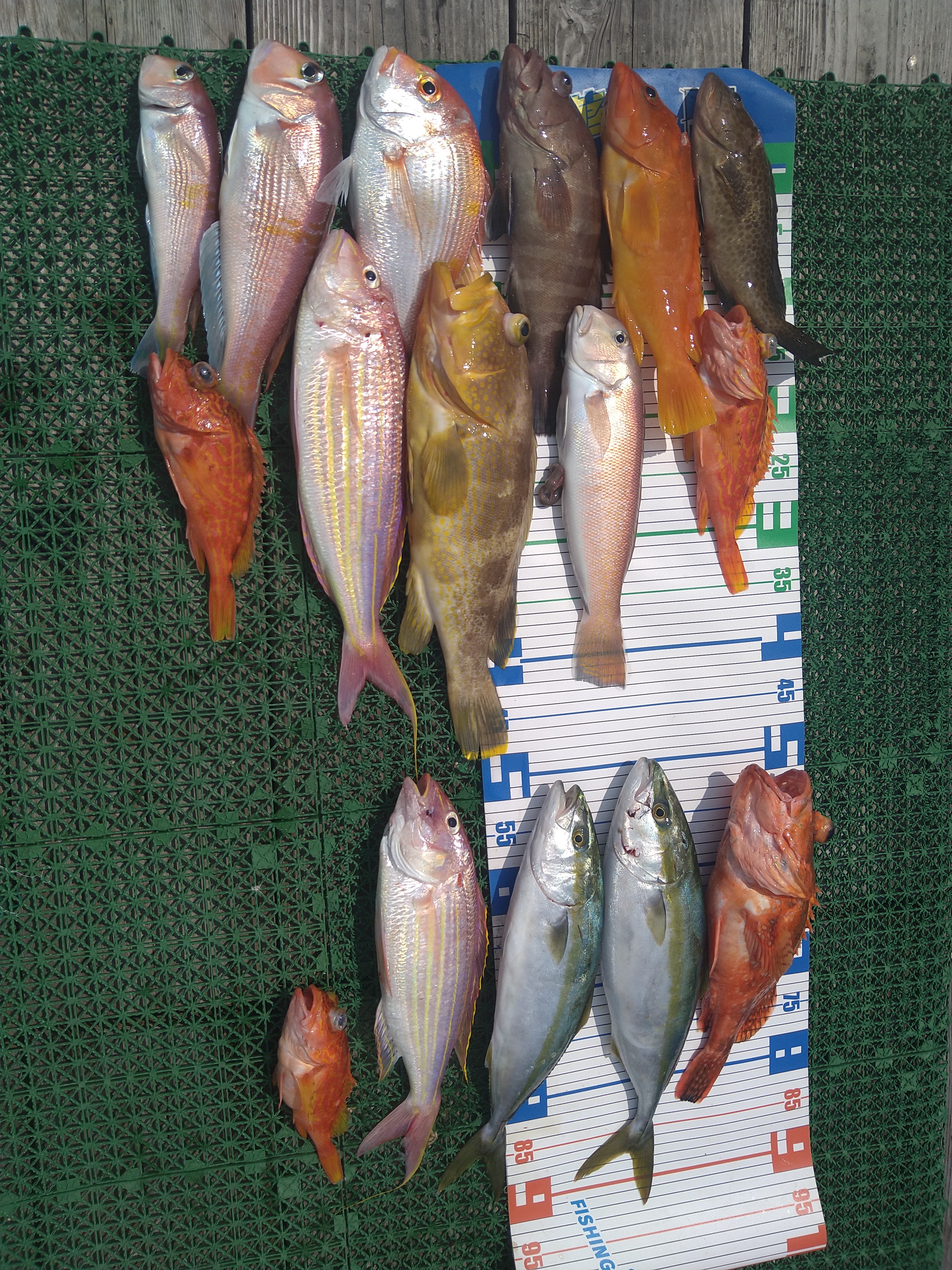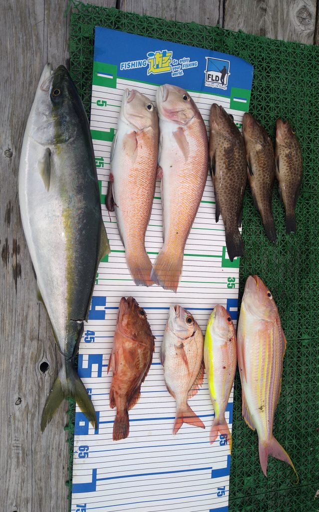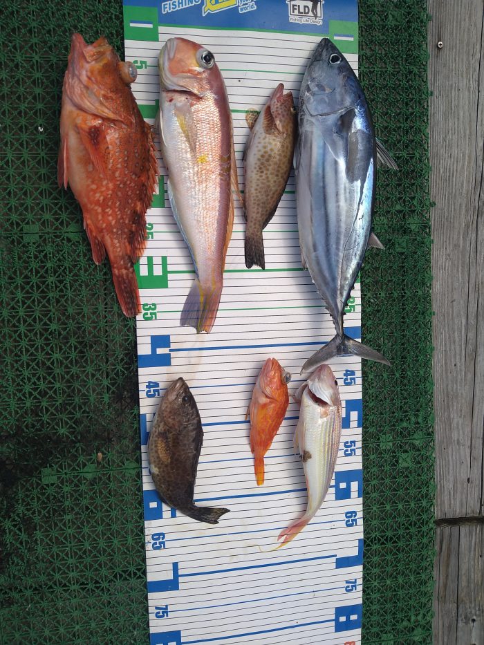 潮の色が黒い、流れない浅場は、潮の色が違って緑色、そんな状況で、アカアマダイ、シロアマダイ、アカハタ、マハタ、オオモンハタ、アオハタ、レンコダイ、イナダ、ウッカリカサゴ、アヤメカサゴ、イトヨリダイと種類の多い釣行になりました。