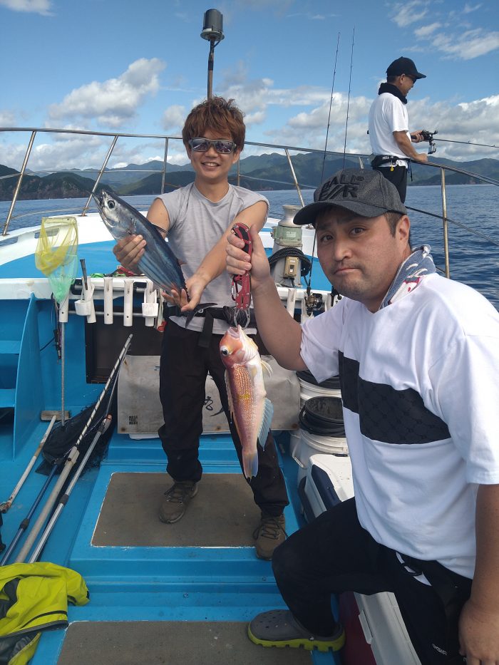 当たりの取りずらい状況、居た居た❗👍 沖合で釣れてるカツオのお裾分け👍高級魚のアマダイとカツオのダブルヒット❗