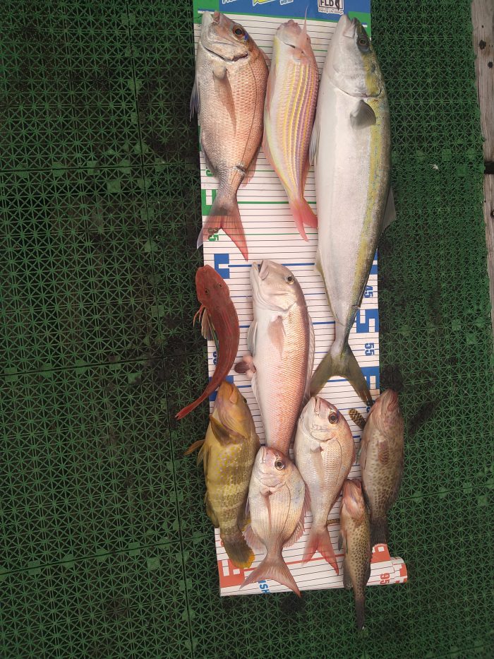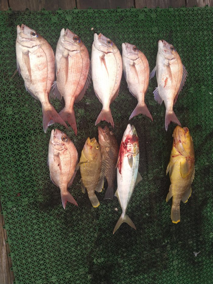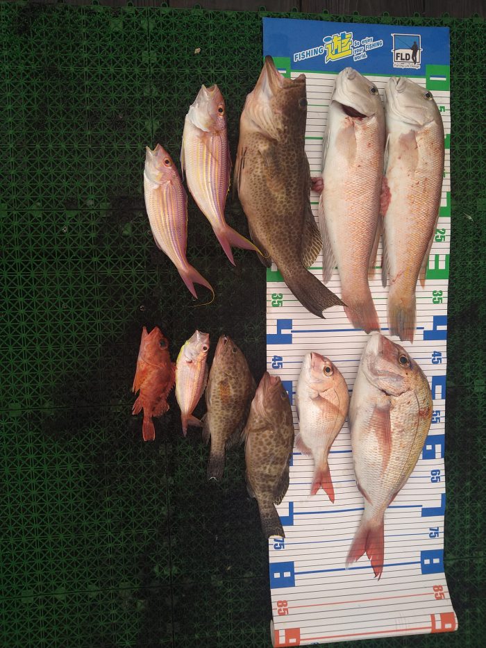 重なる厳しい状況、頑張って頂きました 結果本命マダイ、高級魚のシロアマダイ、オオモンハタ、イトヨリダイで、塩焼き、お造り、松笠揚げから煮付けにお吸い物までの釣果になりましたね。